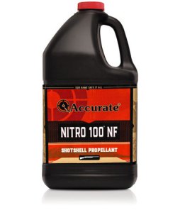 Accurate Nitro 100 NF Powder For Sale In Stock Now is a fast-burning, flattened spherical, double-base shotshell powder that is an excellent option for all 12 gauge target applications due to its clean burning and cost-effective nature.