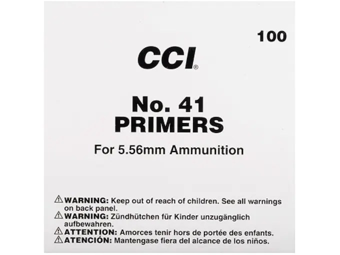 CCI 41 5.56mm Small Rifle Military Primers are made with a special formula that excludes corrosive or mercurial components.Primers for standard large military rifles marked with the CCI #41 designation are suited for, but not limited to, the following popular small rifle calibers:.14-222 ·.17-223 ·.17 Ackley Bee ·.17 CCM ·.17 Hornet ·.17 Mach IV ·.17 Remington ·.17 Remington Fireball …