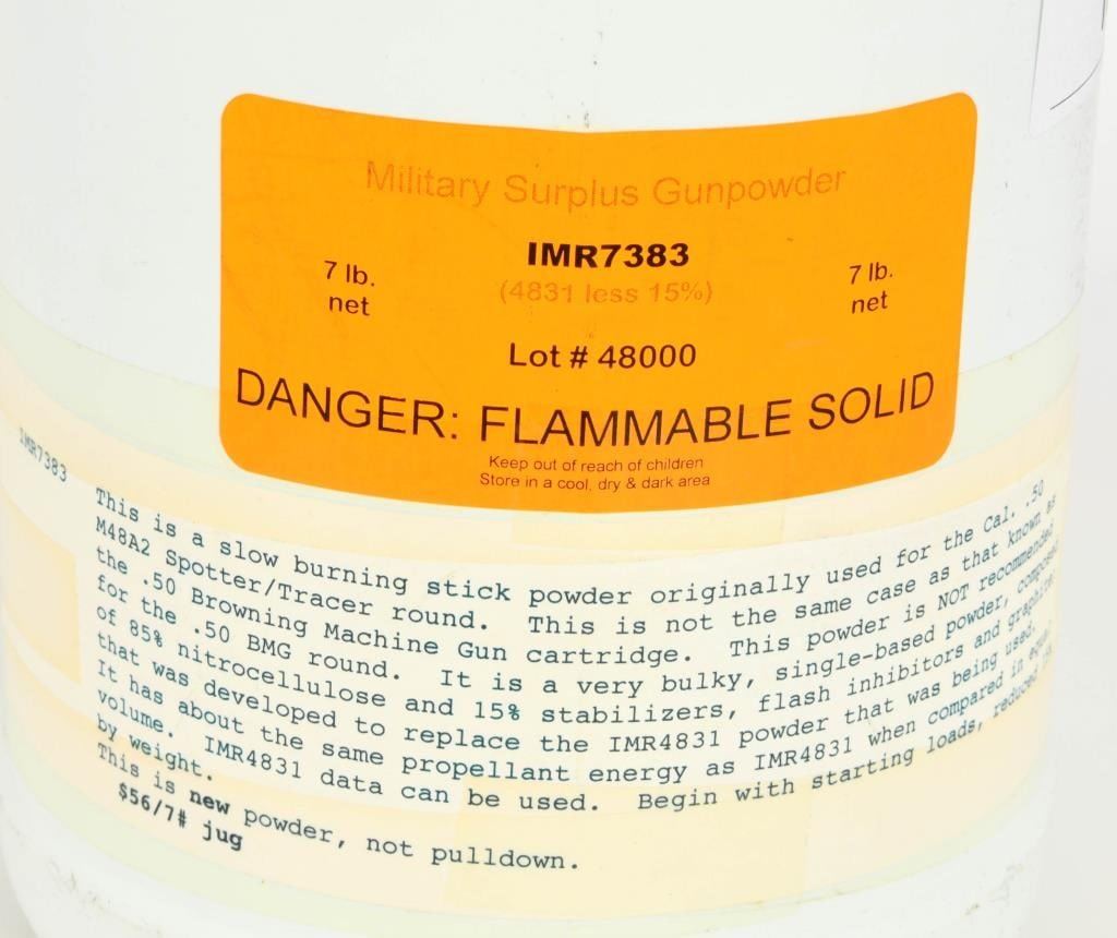 IMR 7383 Military Surplus Powder is a specialized triple-base propellant combining nitrocellulose, nitroglycerin, and nitroguanidine, designed initially for military use in .50 caliber spotter and tracer ammunition. This powder is valued for its flashless ignition, which allows discreet firing without visible muzzle flash, making it ideal for military spotting rifles. Its high energy and slow burn rate provide consistent velocity and excellent ballistic performance in large rifle cartridges, but it demands cautious load development because of its potential for abrupt high-pressure spikes.