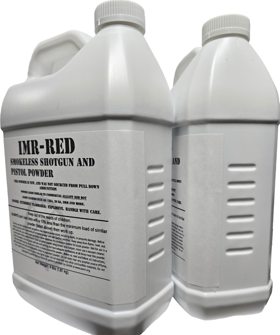 8lbs. of IMR-RED smokeless double-base pistol powder. The jugs as shown are fully individually labeled for easy re-sale on store shelves. This flake powder is recommend for the following calibers/gauges but also performed well with .25 ACP, .32 ACP, .44-40 Winchester, and .44 Russian: