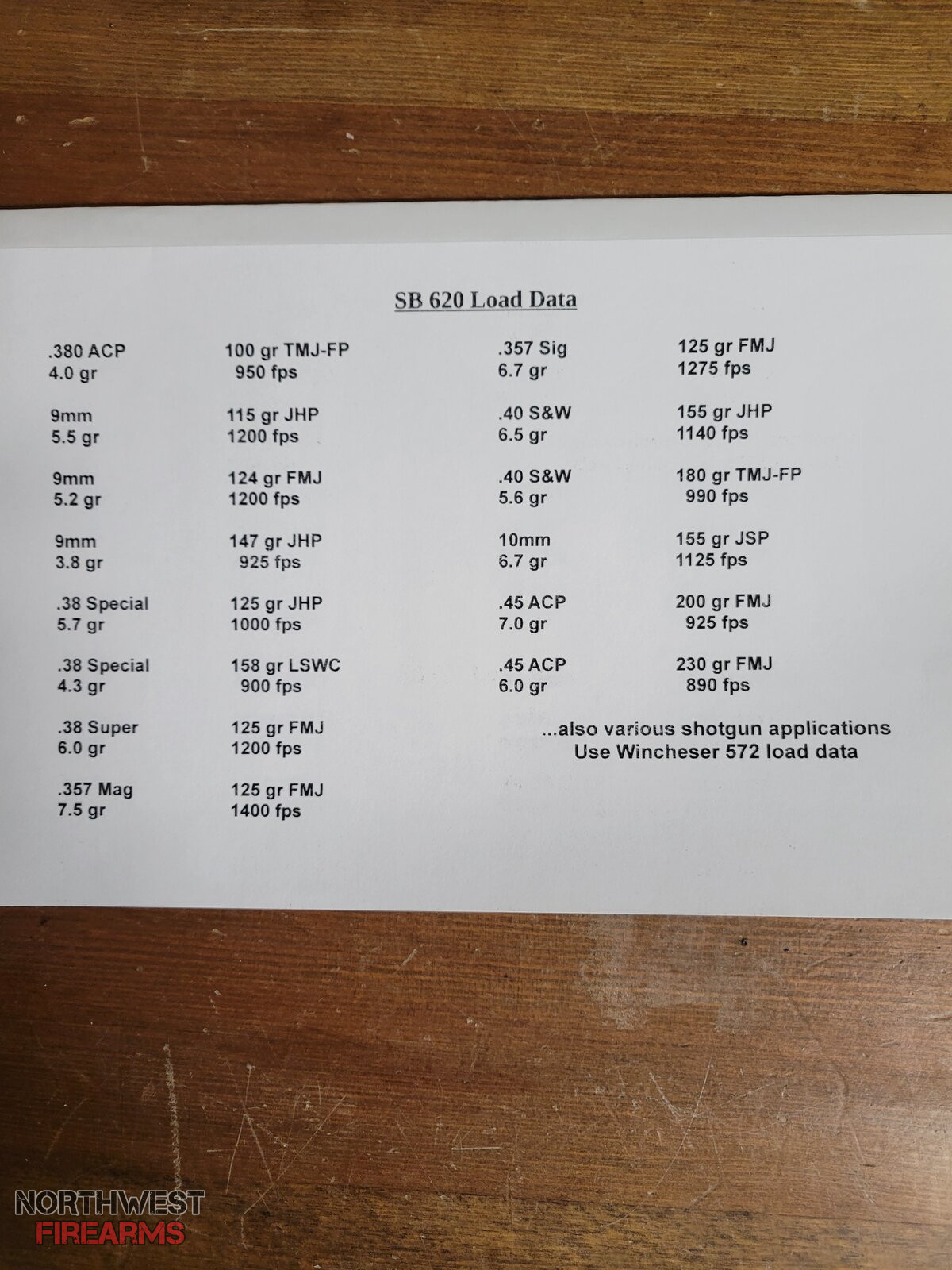 SB-620 Powder is well-suited for reloaders who want a reliable, NATO-approved powder with versatile applications in pistol and small carbine calibers. It is important to adhere strictly to published load data and take recommended safety precautions during load development to optimize performance and ensure safe reloading practices.