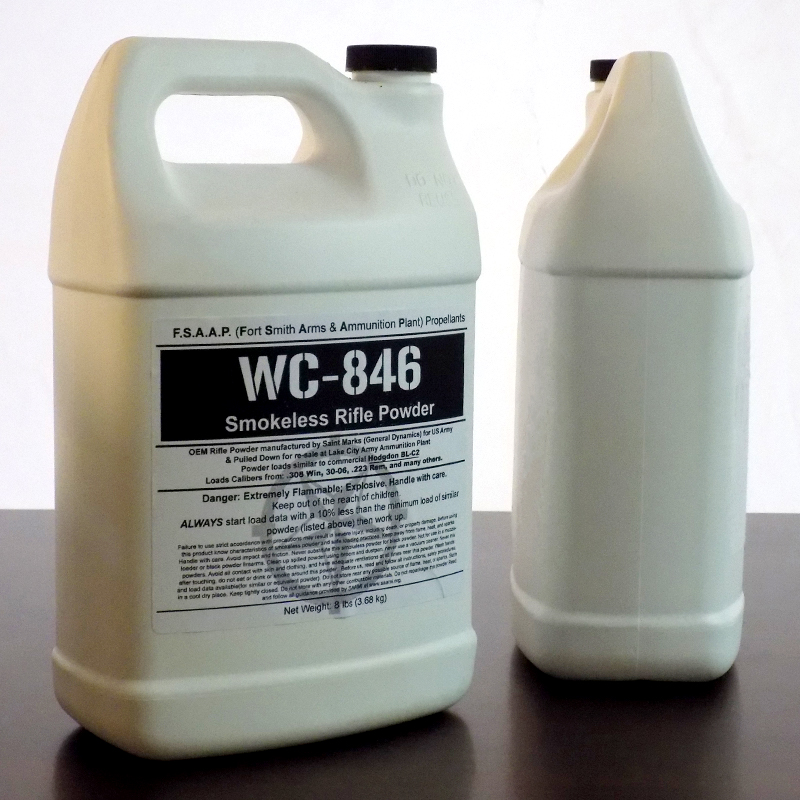 16 lbs of WC-846 smokeless double-base rifle powder packaged in two 8 lb UN 4G Rated Hazmat Jugs within a re-usable shipper kit. The jugs as shown are fully individually labeled for easy re-sale on store shelves. This military grade smokeless powder is a ball-style powder manufactured by Saint Marks (General Dynamics) for the US Army. It was pulled down in 2018 for the Fort Smith Arms and Ammunition Plant (FSAAP) at Lake City Army Ammunition Plant by certified Lake City & ATK Engineers. It has been certified for re-use, pressure, burn rate, accuracy, and unique lot numbers by both entities under ISO: 9001 standards before packaging for re-sale.