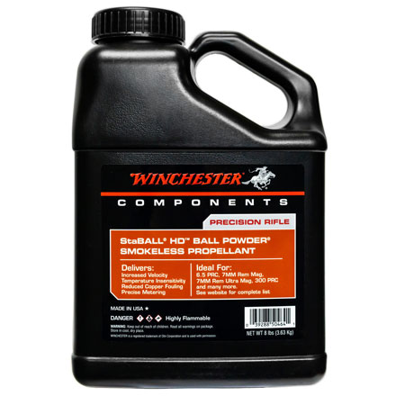 Winchester StaBALL HD is a temperature-insensitive, double-base BALL® Powder that is stable in severe hot or cold temperatures. Winchester StaBall HD Powder For Sale In Stock Now is a slow-burning magnum powder that delivers optimal loading density in huge magnum cartridges suited for the burn speed, making it perfect for 6.5 PRC, 7MM Remington Mag, 300 PRC, and many more! As with other BALL powders, correct metering helps to constant velocity and pressure with reduced standard deviations, both of which are critical for the match grade accuracy of Winchester StaBall HD Powder For Sale.